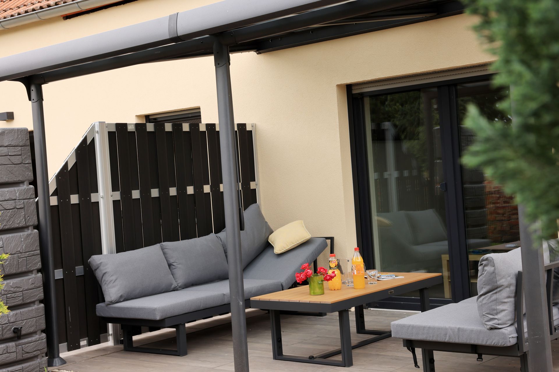 Na prostorné, částečně zastřešené terase orientované na jih si můžete odpočinout na pohodlném zahradním nábytku nebo lehátkách s ničím nerušeným výhledem na pole a louky.